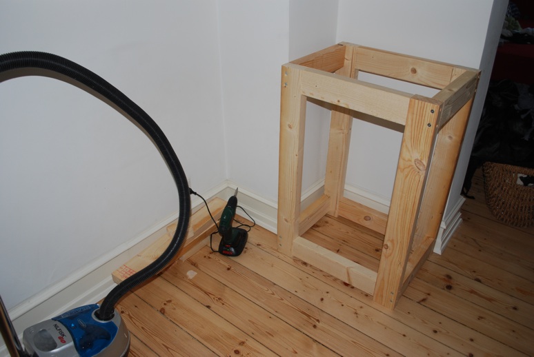 Jaeh tjoeh. Ja altså, jeg er meget forsigtig ved det her da det er en gammel lejlighed og der er gamle gulve. Jeg må lige smide et par billeder af rammen til underskab så I kan se hvad jeg mener. Idéen var, at den skulle hvile på tre af hjørnerne (to af siderne) på væggen, og så et sidste ben. Men her blev jeg bekymret for, om gulvet ville give sig lige så snart der kom vand i. Eller rettere, det vil det helt sikkert. Jeg er sikker på at bordet ikke kommer til at vride da det er bensolidt bygget. Det er bygget med 95x45mm brædder. Det skal nok holde