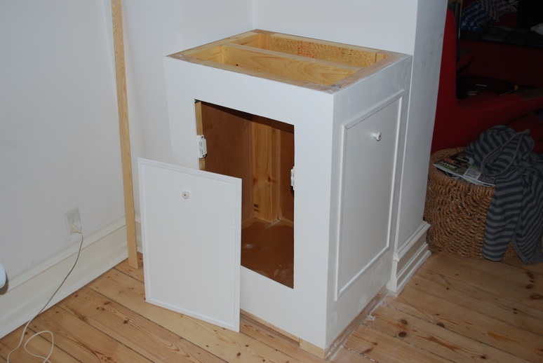 Umiddelbart vil jeg mene, at det vil være fint blot at klodse det op, men da jeg godt kunne tænke mig at spartle skabet ud med væggen og videreføre fodsokkel rundt om skabet kunne det være fint hvis det ikke gav sig for meget - men det er selvfølgeligt "vand" sammenlagt med problemet med 200 liter vand ud på mit gulv. Snøft.