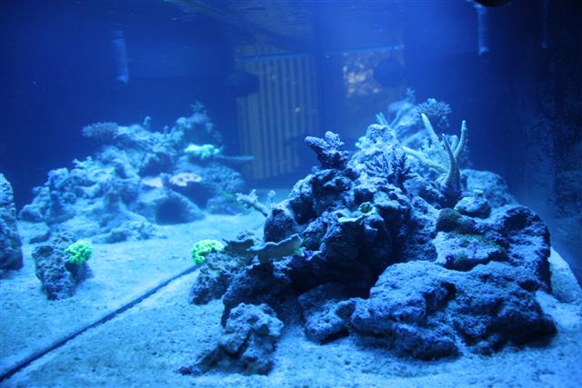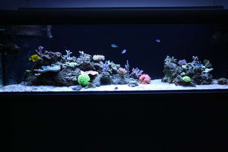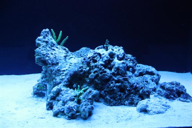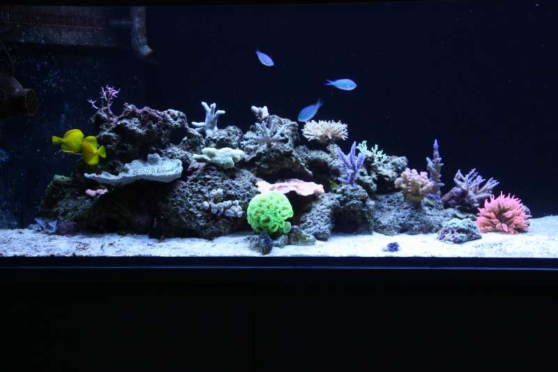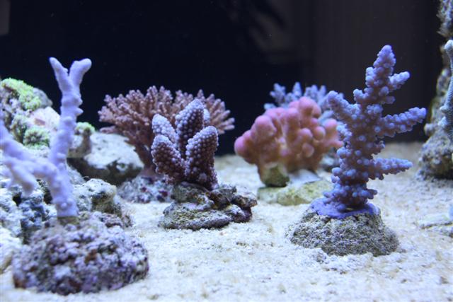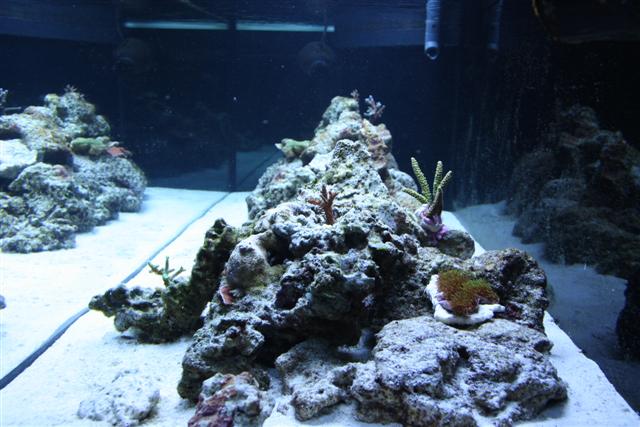 Så er det vidst ved at være tid til en lille opdatering. Har haft store problemer med alger siden februar. Var ellers ved at være igennem opstartsfasen, men lavede så en brøler. Kom sand i mit refugie som ik var beregnet til saltvand, men ferskvand og det indeholdt store mængder silikat, så i løbet af kort tid var alt bare dækket af brune alger, skod. Men sandet er fjernet og algerne er på retur, der er dog stadig en del på sandet. Jeg har anskaffet mig en søhare igen og bruger rowaphos i en filtersok i sumpen, så det går den rigtige vej med algerne. Er begyndt at tilsætte balling, da mine værdier ( KH og Ca ) begyndte at falde, og der er tydelig vækst på mine koraller, så det er skønt :) Dog har min røde plademonti mistet meget farve, men håber det kommer igen. Jeg har lavet en smule om på min stensætning, da jeg ik var helt tilfreds med den første, den nye står mere stabil. Her i den sidste uge har jeg købt lidt flere koraller, både fra private og fra dejong, så det begynder efterhånden at hjæpe på det. Så nu efter jeg lige får korallerne arrangeret ordenlig, tror jeg bare det ska ha noget ro, men det er sku svært ik at stå med hænderne dernede hele tiden :naughty: . Nu håber jeg jeg kan holde liv i dem. Her er lidt billeder.