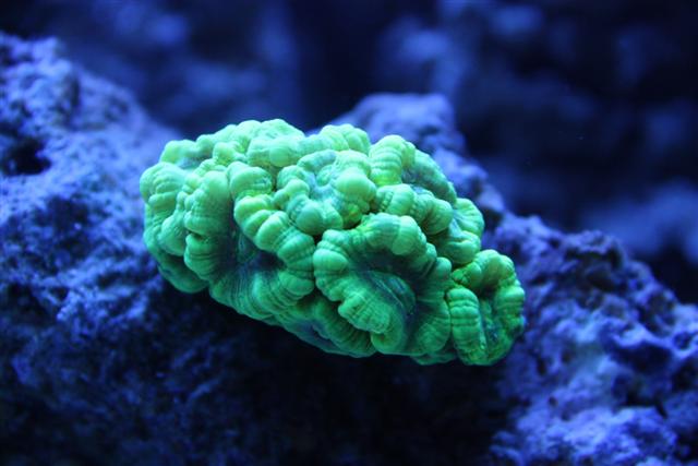 Grøn acropora staghorn under blå lys.