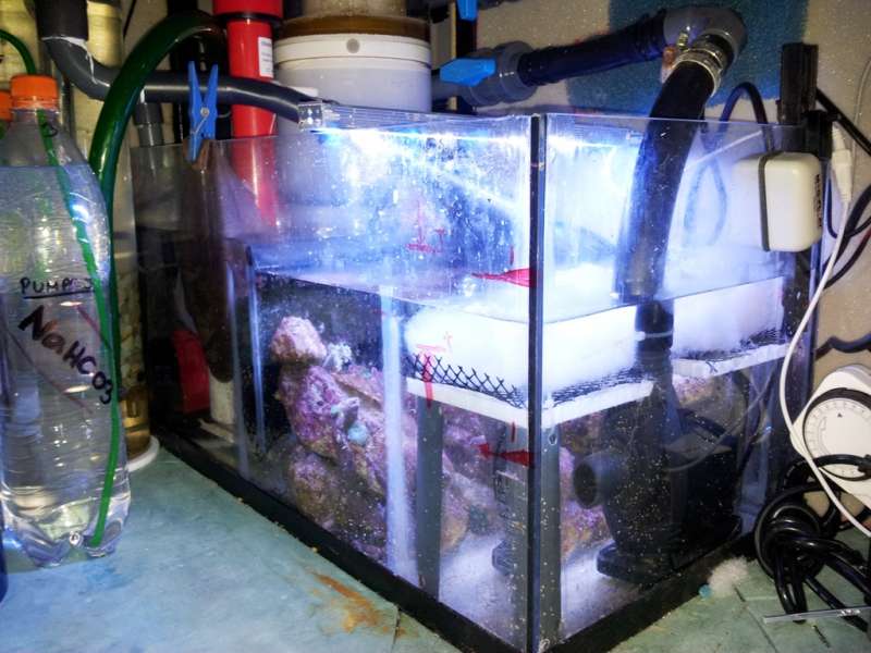 Vandet løber derefter over , hen over filtervat, inden returpumpen smider det op i akvariet igen.