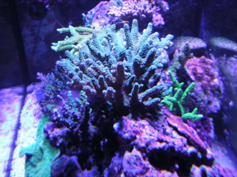 Bemærk den tykke Acropora abrotanoides i baggrunden. Nu er den stort set kun grøn, men da jeg købte den, havde den lyserøde ender. Se næste billede.