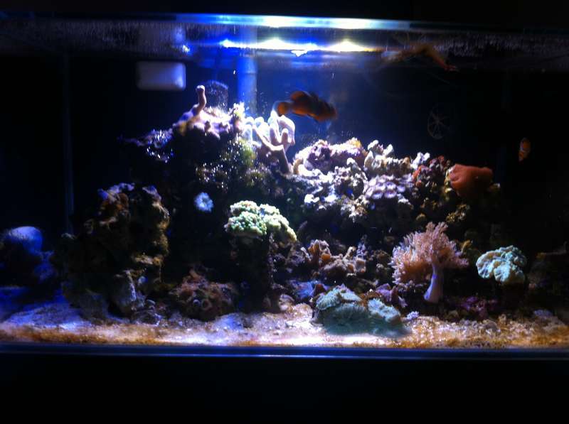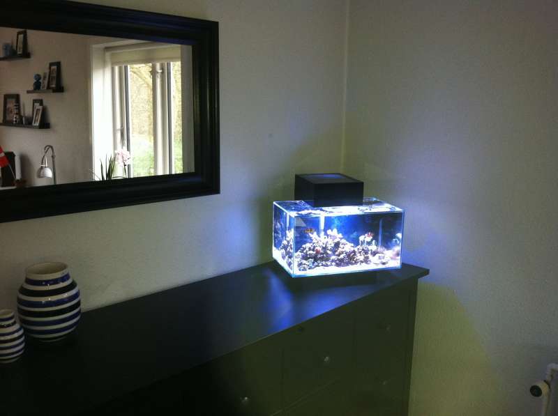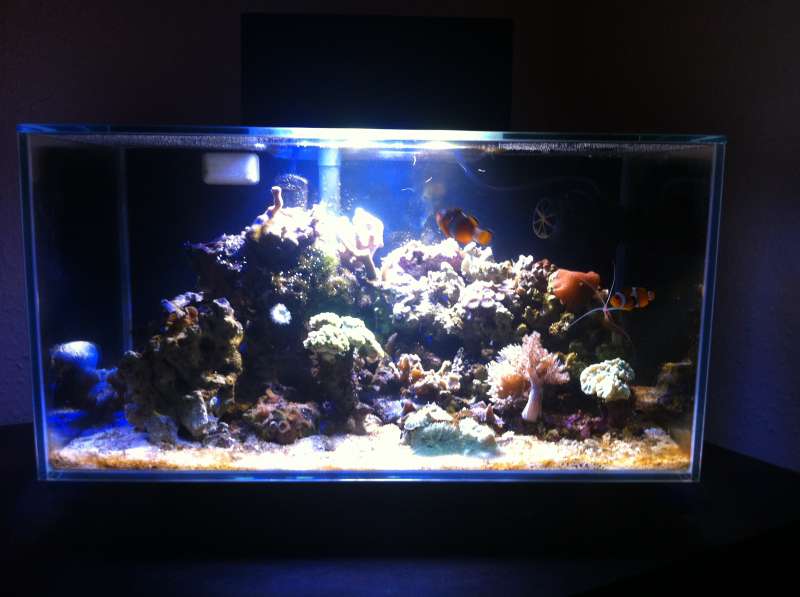 Så følger der lige en lille update. Mine to klovne trives og rejen ligeledes. Jeg købte en rørorm, som besluttede at hoppe ud af røret. Uden sit rør ligner den en udenjordisk væsen. Nå, men nu er den igang med at lave et nyt rør, så jeg formoder at alt er i den skønneste orden. Korallerne hænger lidt med hovedet, men det skyldes nok de konstante forandringer omkring dem. Vandskift og en del roden rundt med tingene har været nødvendigt, men nu er tingene som de skal være i selve akvariet. Jeg har i dag monteret folie på bagsiden, hvilket jeg allerede er træt af. Der er tale om skabsfolie fra Bauhaus, så det er svært at glatte bobler ud når akvariet ikke kan vendes. I fremtiden vil jeg male baggrunden sort da jeg godt kan lide at man ikke kan se ledninger osv, som gemmer sig bag akvariet. Jeg er nu gået på jagt efter en vortech mp10, der skal sikre bedre cirkulation i den lille pyt. Mit lys er jeg rigtig godt tilfreds med. Det består af 12 x 3w Cree LED. 6 cool white og 6 royal blue. Jeg har indtil videre skiftet 10 liter vand af gangen, men måske er det i overkanten. Her tænker jeg på at det jo er noget af en omvæltning for korallerne med så stort et vandskift. Hvad vil I anbefale når man kører uden skummer? Og hvor ofte vil I fodre et par klovne i et småt skummerløst akvarie.
