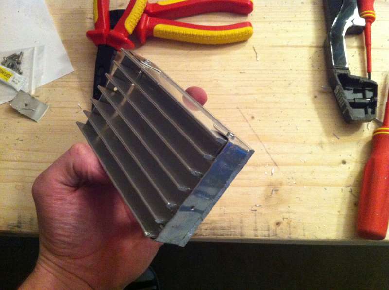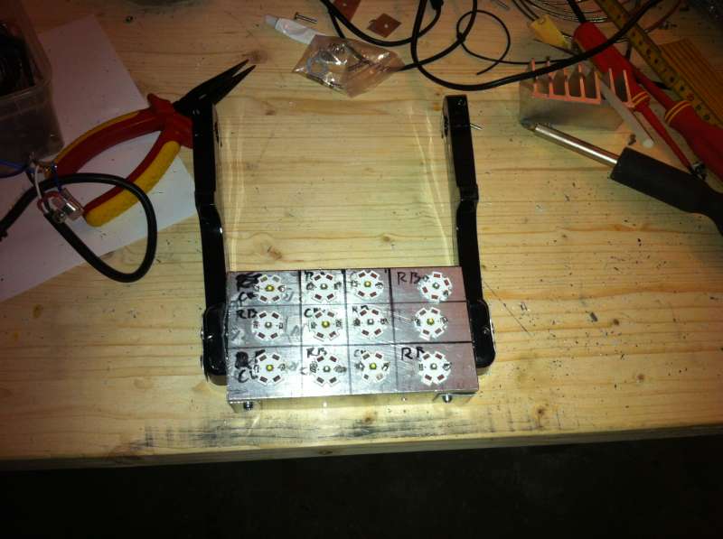 Jeg er selv igang med at køre et op - samme fremgangsmåde. Jeg har dog "kun" 3 x 3watt x-cree og 2 x Royal blue. Altså 5 dioder i alt på en noget kun tykkere heatsink end din. Allerede nu er jeg bekymring for varmen som de vil genere - er du ikke skrækslagen med alle de pærer du har monteret?