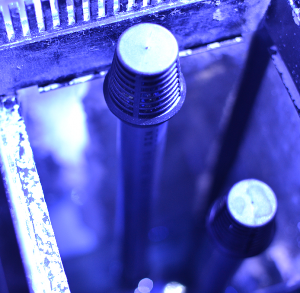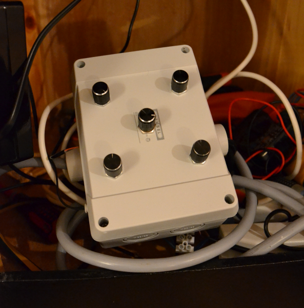 De øverste 2 potentiometre synes henholdsvis kanal 1 og 2, altså blå og hvid. Det midterste styrer blæserhastigheden og de nederste 2 styrer kanal 3 og 4, henholdsvis UV/violet og rød/grøn.