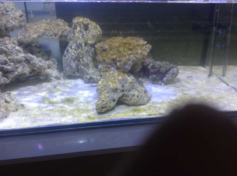 Selve Display er dog blevet fyldt med vand, der mangler kun de sidste 5cm op til overløb, og tingende er sat i gang :y . Jeg syntes jeg har haft lidt bøvl med at få processen startet denne gang, efter 14 dage var der stadig ikke skyggen af brune alger, til trods for at jeg havde podet med en sten fra mit gamle akvarie, der skal dog siges at jeg havde renset denne sten for det værste snavs, og måske det er årsagen til dette.