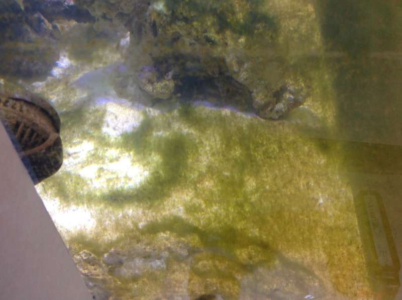 Så blev frontruden renset for alger, så nu kan man igen kikke ind. Og som i kan se er der stadig godt gang i de grønne alger. Mit bud er at de største er ca 7 cm, og vokser stadig :y :y .