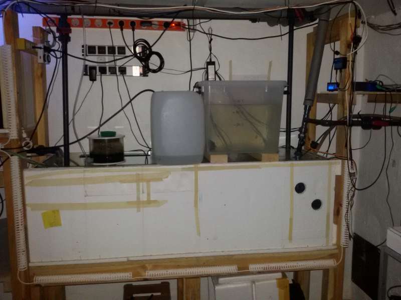 Ca. 400 L sump. Isoleret og overdækket. Returpumpen helt til højre. Lige nu med 40 L vand blandet til vandskifte og en 20 L dunk med RO vand på vej til tanken med automatisk opfyldning.