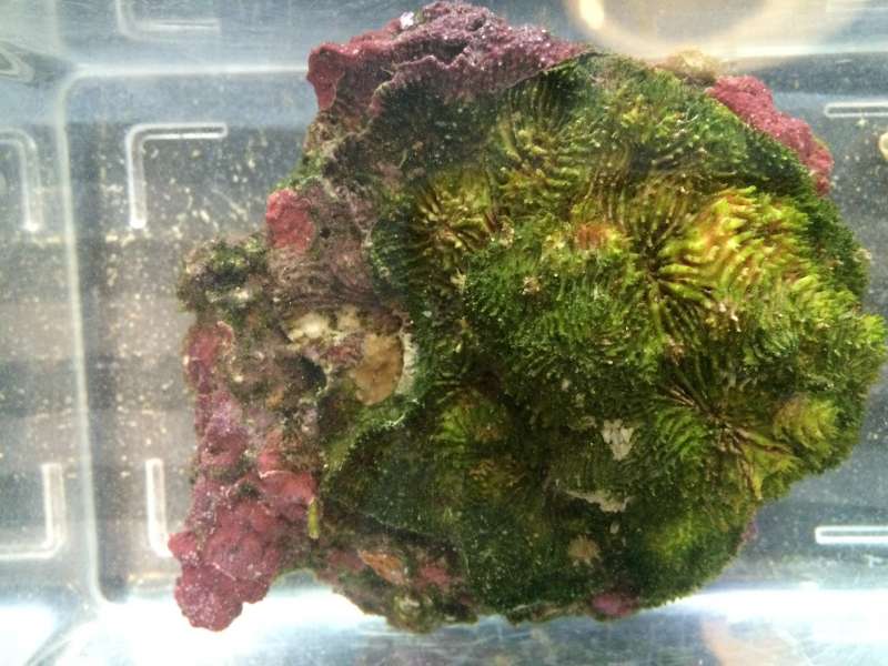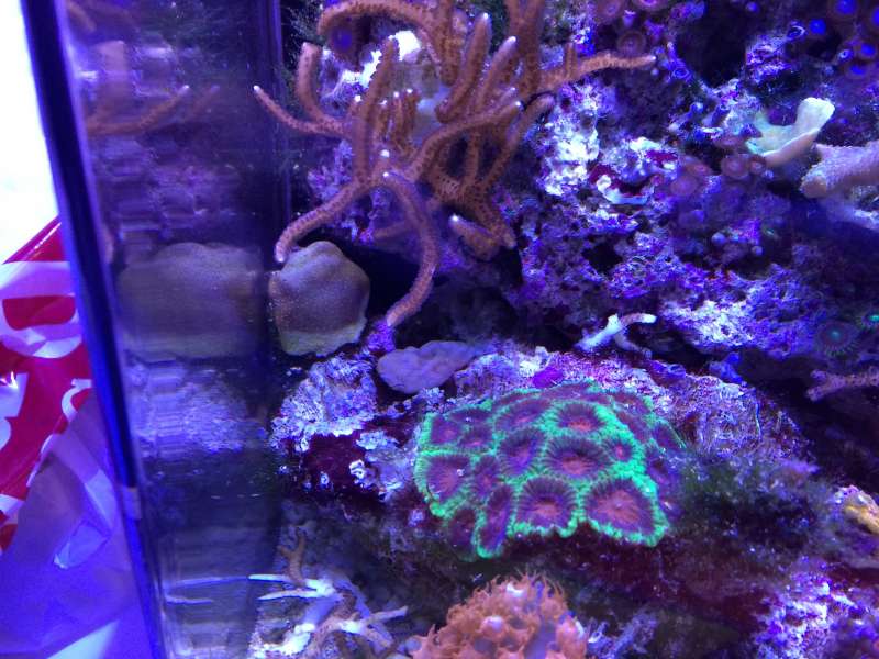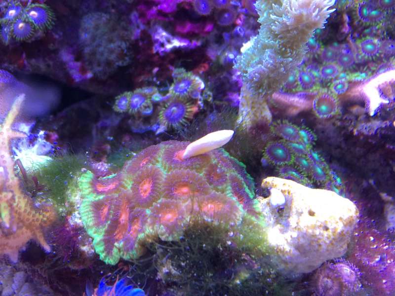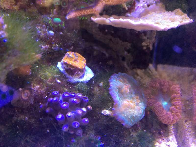 Så blev der flyttet lidt om og søpindsvin er væk da det var færdig med at fjerne alger og så blive der fjernet lidt sps som voksede lige hurtigt nok og som en paradis snegl(speciel turbo) kom til at tromle ned og så var det for svært at lime dem i igen så andre lps og sps er kommet i men en bestemt er jeg glad/stolt over og det er en enkelt polyp favites/favia på under en mm og den overlever og har nu vækst kant hele vejen rundt.