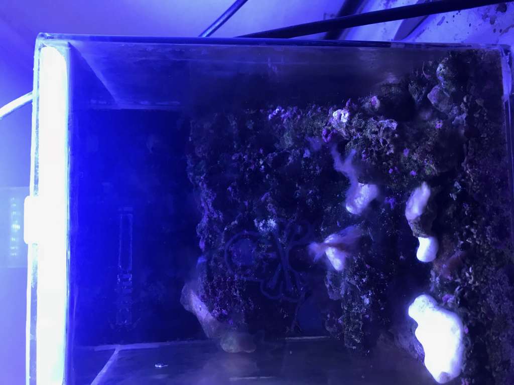 Så fik jeg nok af de alger og har ansat et lille rengørings hold til at fjerne dem for jeg gider ik fjerne flere når de bare kommer igen lige så hurtigt, det nye hold er lidt specielt da de jo gerne skulle tage de der bryupsis hår alger eller hvad de nu heder og derfor er der købt et meget lille lang pigget søpindsvin og en tornsnegl en paradis snegl(Moon turban) og en Halloween eramit og de er super dygtig men de er desvære lidt for dygtige da de løfter mine fine koraller for at se om der er alger under dem så nu ligger de rundt omkring og brænder eller bliver brændt men ellers ser det ok ud og de er ca halvt færdige og så må de søg ansættelse i en af mine andre akvarier for jeg løber jo snart tør for lim sådan som de vælter ting.