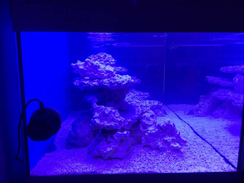Jeg ville fjerne de flade sten øverst syntes det ser unaturligt ud og så vil de skygge for alt nedenunder. Hvis du primært skal have Sps koraller ville jeg ikke selv bygge min stensætning højere end end 1/3 af højden på baljen, jeg garantere for at korallerne nok skal fylde pladsen ud! Ellers er du på rette vej