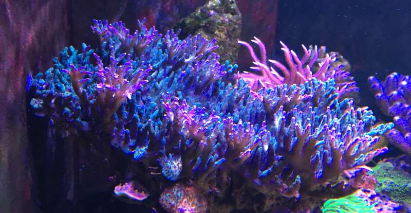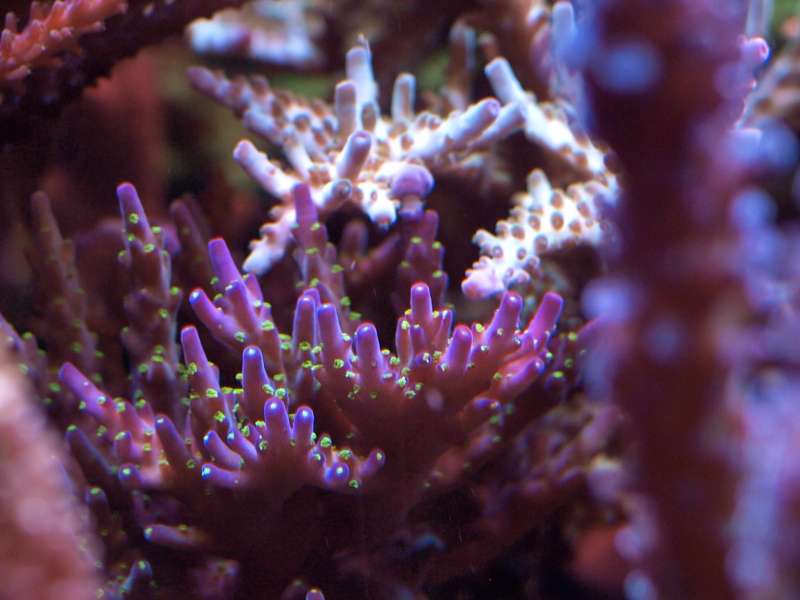 Alle de sider jeg har set med Acropora Nana siger den har creme farvet polypper. Dem på min er skrig grønne og selve korallen er brun/rødlig med mørk lille spidser.