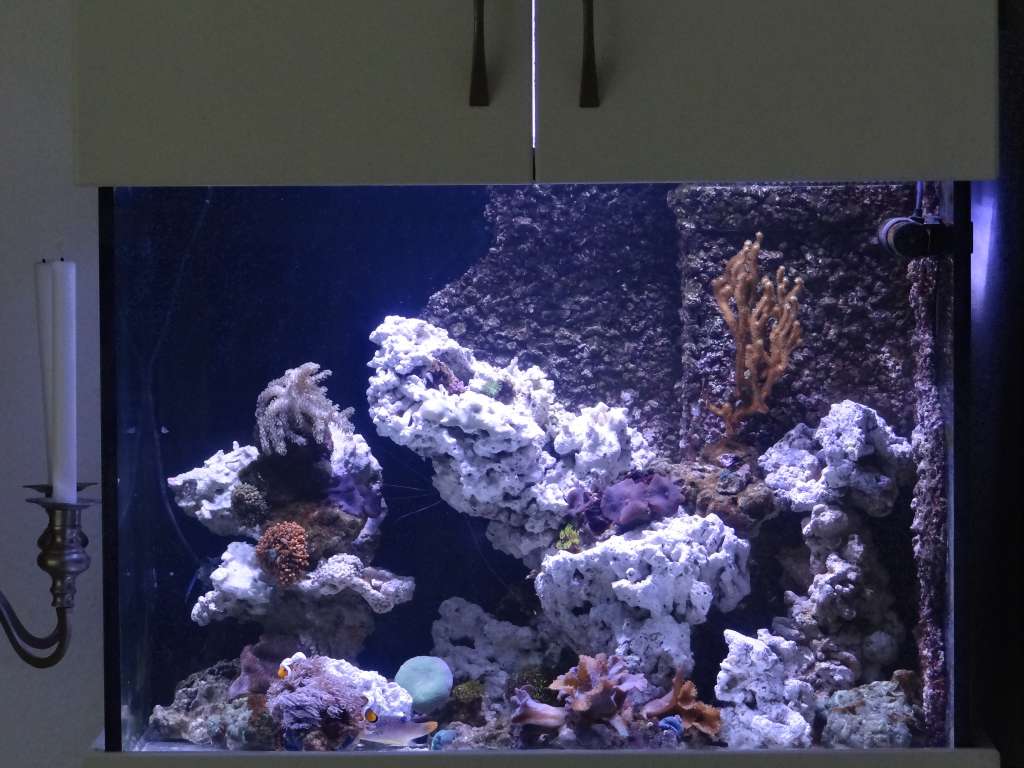 Fiskebestanden består af et klovnfiskepar, en gul kirurg, en picassofisk, en gul gylte og en ildhalekutling. De får mad 3 gange om ugen, typisk en frostterning eller en blåmusling.