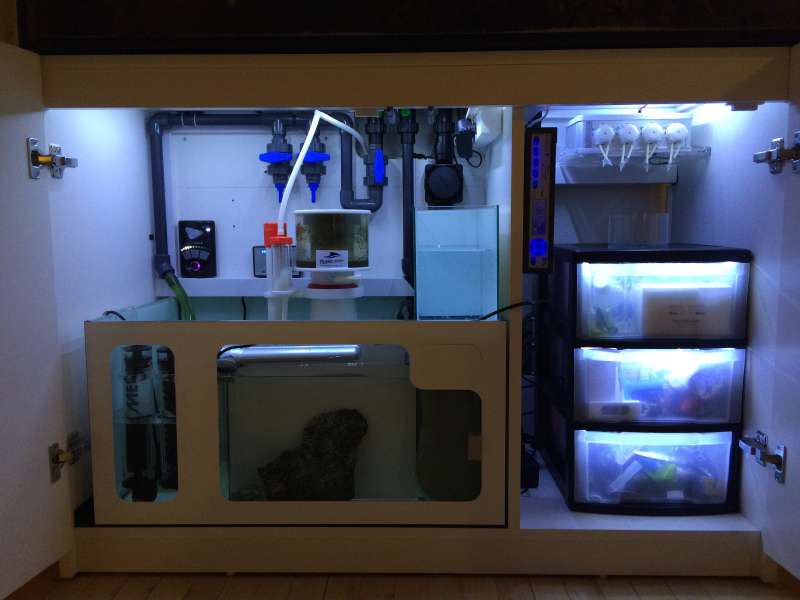 Det ser godt ud Simon. Slangerne kan jeg lave på samme måde fra doseringsmaskinen til sumpen. Skal blot finde den mest hensigtsmæssige vej fra dosering doseringsmaskine til væskebeholderne til venstre for sumpen. Refugium har jeg også tænkt mig at lave for, at kunne holde alger og lave pods. Har du bare skåret folien med hobbykniv? Det ser fint ud. Og hvad er det for noget lys du har i skabet?