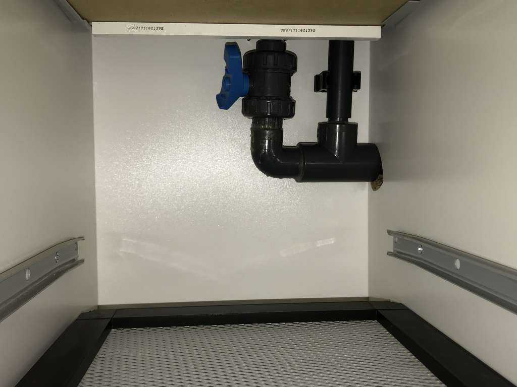 For at spare på rør frem og tilbage, er de 2x 20mm gennemføringer til hhv. nedløb samt sikkerhedsrør samlet i en manifold nede i skabet, og går til sump i ét 25mm rør.
