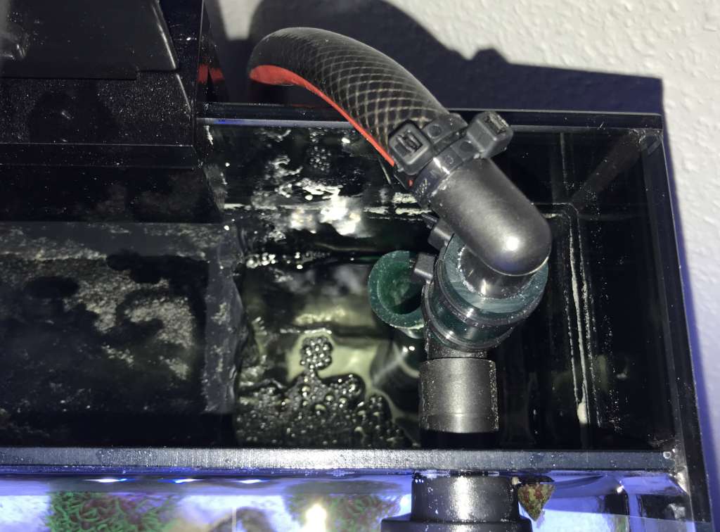 Returvandet kommer i en 16mm slange, og benyttter den oprindelige udgangsstuds i akvariet, monteret med en Innovative Marine Spin Stream - Udgangsstuds der roterer stille og roligt.