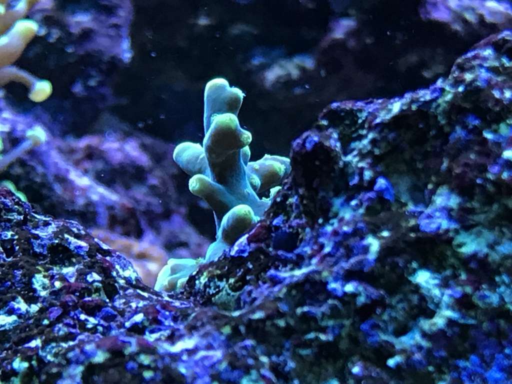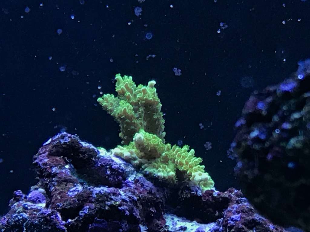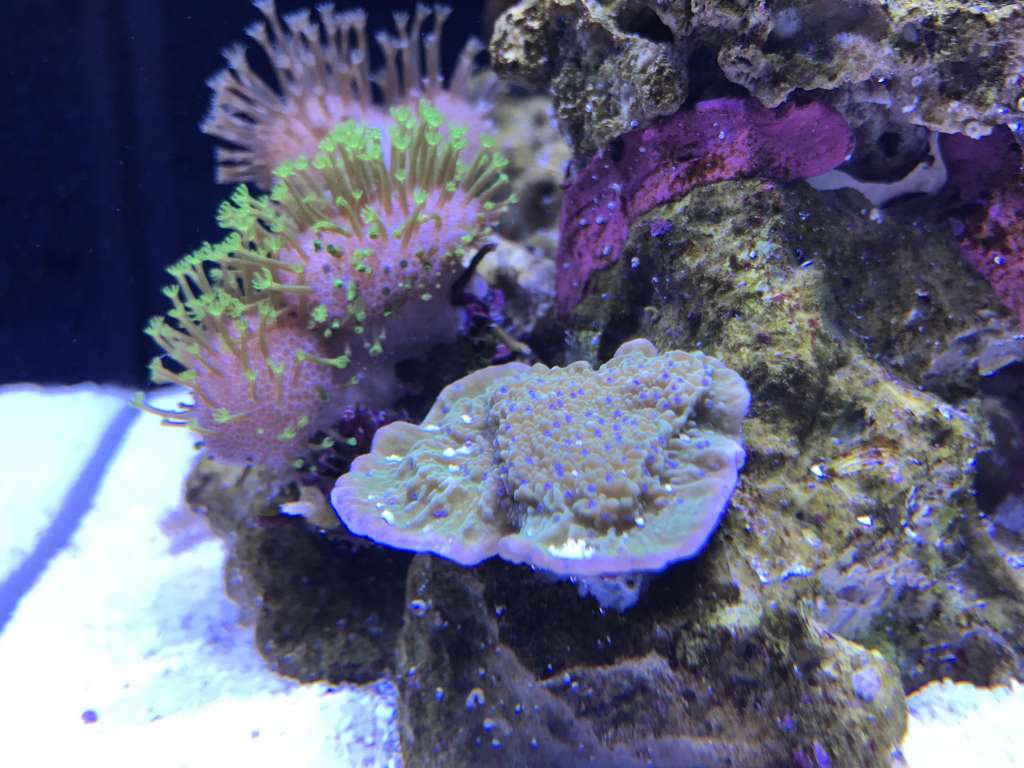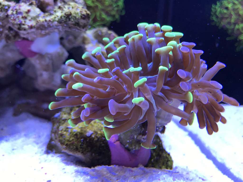 Koral mæssigt er der ikke rigtigt sket så meget. Polypudfoldelse er lidt tilbagetrukken efter C. collare er tilføjet da der bliver nippet til alt. Meget nysgerrig fisk, spiser ikke korallerne, men smager på det hele. Den har været i tanken i 14 dage nu, og er begyndt så småt at tage lidt foder. I takt med at den tager mere foder til sig har der også været mindre koral nipperi, og polypperne viser sig så småt igen. Til gengæld har den barberet akvariet for glasroser - Der var 500+ små roser, bogstaveligt talt hvert et sted der fik lys. Jeg kan nu ikke finde en eneste glasrose - End ikke de store på Ø 4-6cm. Alt er væk.