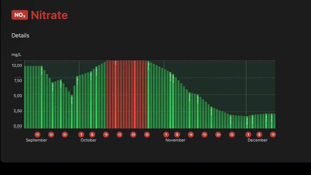 Mit nitrat er desværre begyndt at synke igen. Har idag reduceret NOPOX dosering til 4ml daglig