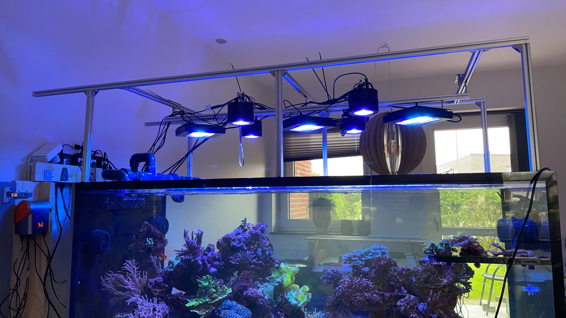 Lys har jeg brugt kombi system, men også reduceret kraftigt pga af elpriser. Inden jeg tog det ned til kun 3 lamper som er centret over mine acroporaer, brugte jeg 4xT5 blue+ 4x Kessil a360w, + 4 Ecotech xr15 g5 blue. Bruger AB+ på Ecotech 70%