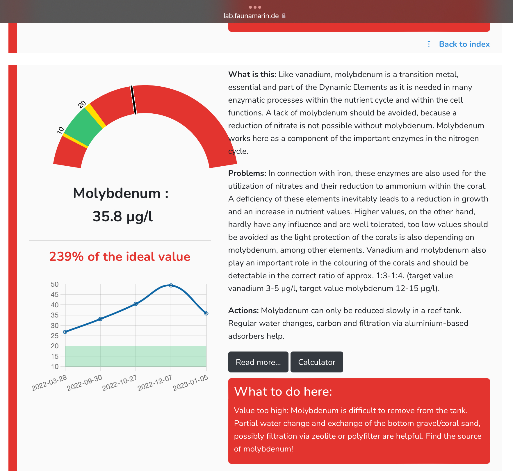 Der blev desværre ikke taget test i osmose vandet, af det sporstof, Molybdenum som var kommet op på 0,049mg/l, hvilket er 300% højere en det anbefalede.
