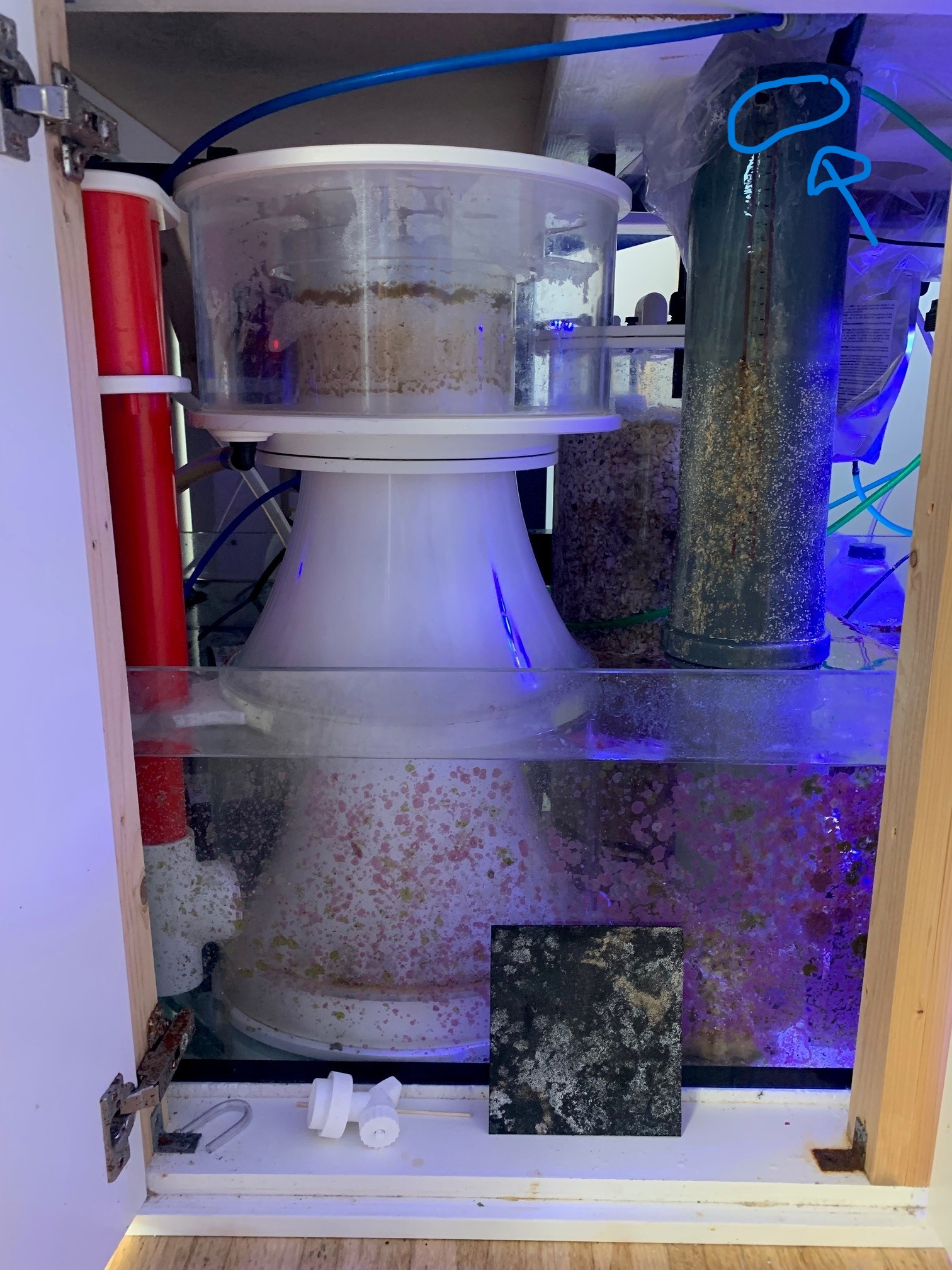 har brugt sammen løsning som Erik dog hvor designet var et gråt afløbsrør. Inden i røret var et mindre pvc rør der gik ned til bunden ståledes at udgangsvandet fra reaktoren var ført ind i det lille rør, som gik ned til bunde af det store rør. Det medførte at alt vandet blev skubbet op i gennem al det koralgrusset røret var fyldt op med og løb ud af et lille hul jeg havde boret i siden på røret øverst oppe. Som jeg lige husker det var røret 10 cm i bredden og 65 cm i højden så der kunne være meget koralgrus i det.