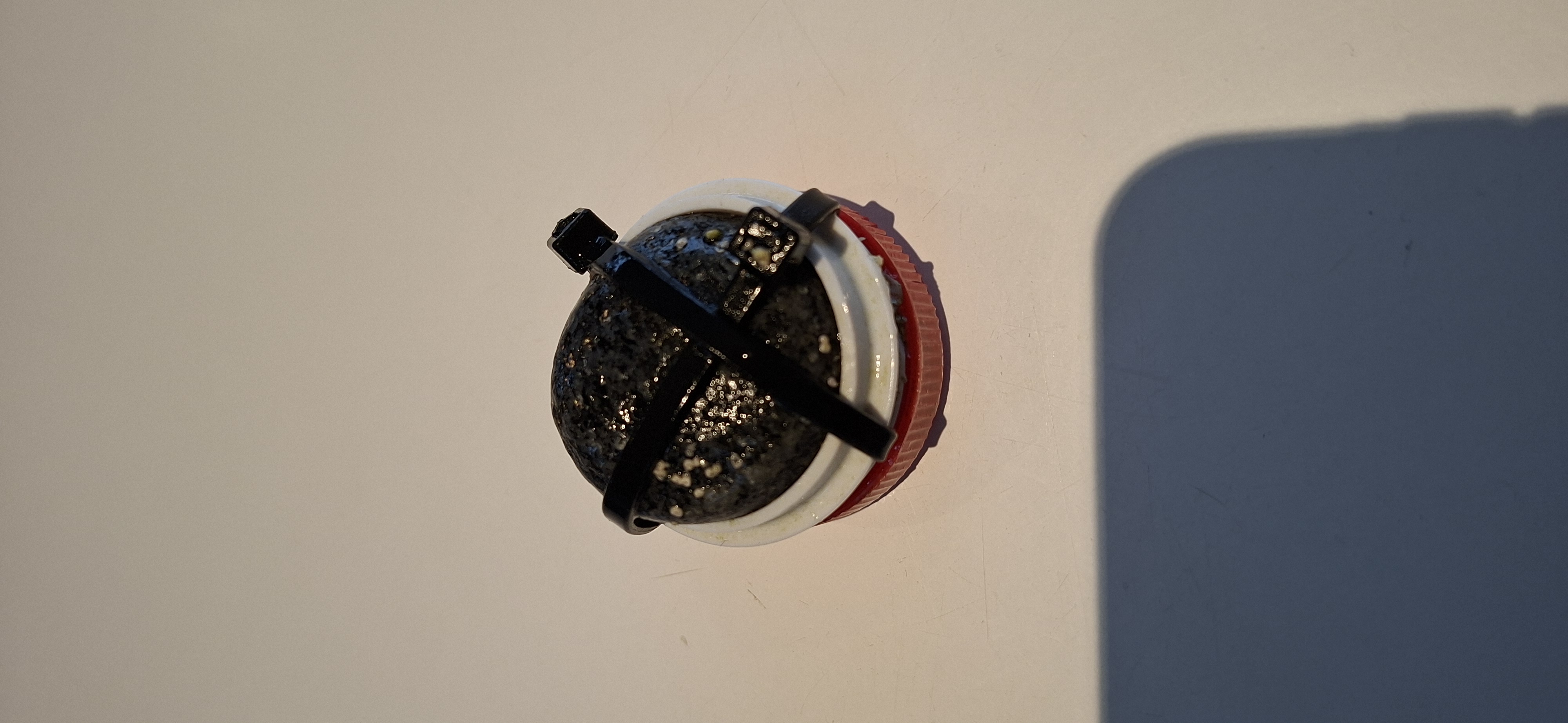 Jeg har skåret toppen med gevindet af en plastik flaske, og monteret en flad sten under og boret nogle huller i låget. Så fodrer jeg bare med mysis, atemia og blåmuslinger. Alle de andre fisk står i kø når der fodres, da de ved at det kun er pincetten der kan få foderet op