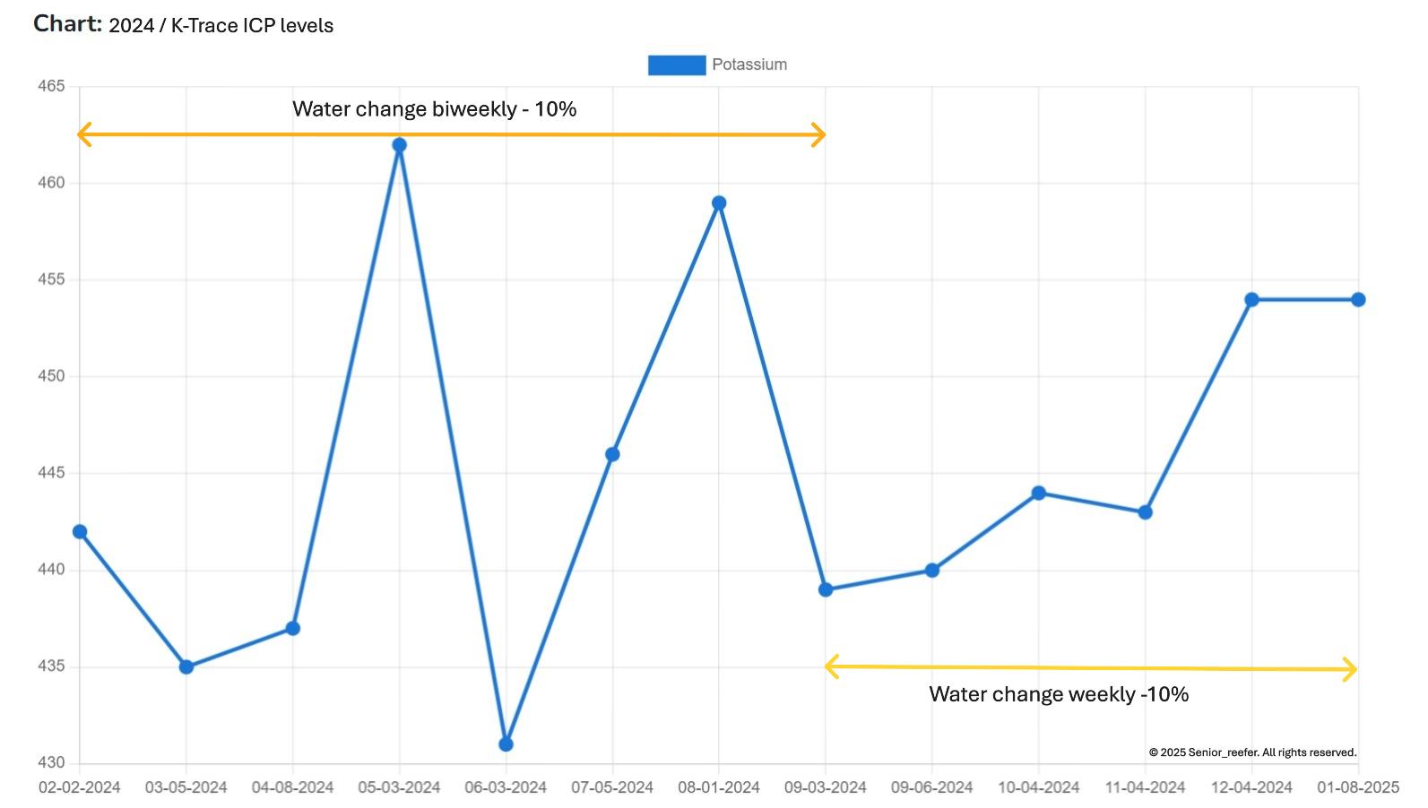 Hvad nu hvis at calcium reaktoren giver et supply af kalium. Vandskiftene presser mængden ned. Men Seniorreefer har så god succes at reaktoren øges hele tiden og derfor frigives der ekstra kalium, men ikke nok til at det stiger pga vandskiftene.