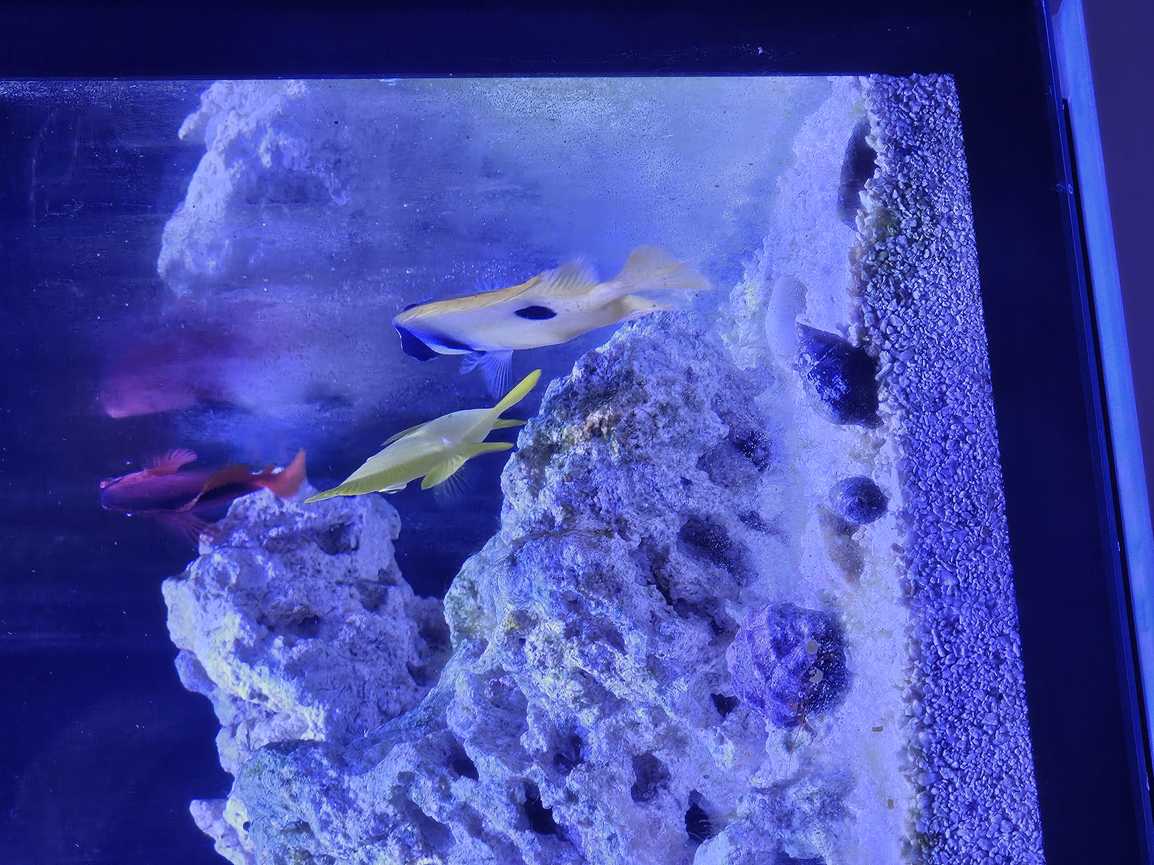 Nej det er lkke den første fisk, jeg har nogle andre også. og få koraller og så masser af alger til den, fodre også grønt pellets artemia og nori til den, har også mine klovne, danneborgs rejer mv,
