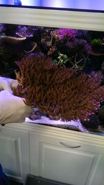 Huhh... fortæl mig om det, min store Acropoa Nana i midten, var 1 cm fra frontglasset, og jeg havde længe gået med tanken om at flytte den, eller sælge den hvis den ikke kunne flyttes. Men jeg valgte første løsning, hvilket krævede at jeg savede foden af den, for at den kunne komme længere tilbage i tanken. Så frem med Fein cutteren, og af med foden, som var 7 cm i diameter. Med lidt besvær fik jeg bakset den tilbage på plads, den ser ikke ud til at være muggen over flytningen, men den står også næsten på samme spot, dog noget længere tilbage.