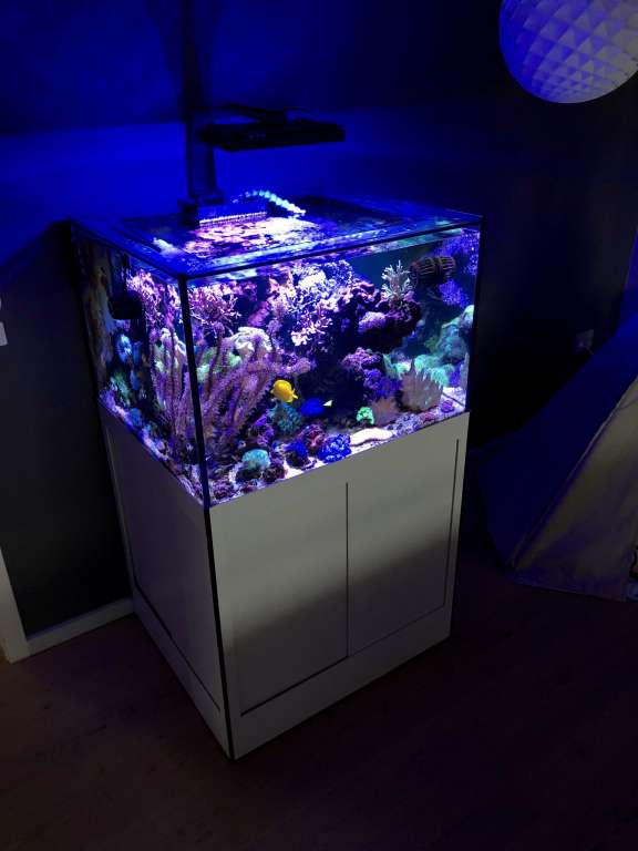 Akvariet har efterhånden kørt siden 10 nov 2020, hvor det blev startet op på keramiske sten/branches, bacterie blend/therapy fra faunamarine, levende sand fra red sea.