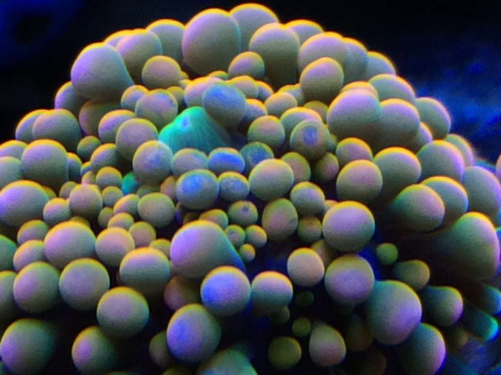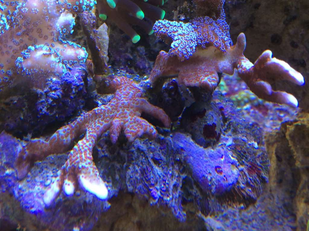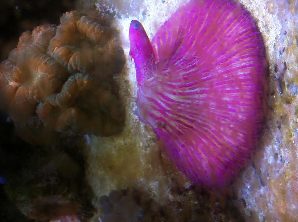 Et lidt alternativt billede med alger på ruden osv., sol jeg faldt over i billede mappen på telefonen. Det er et billede fra efteråret '14. Det er Mic4700's nuværende lilla fungia, der har fået fat i en gramma loreto(måske en fridmani), der må have været lidt sløj.