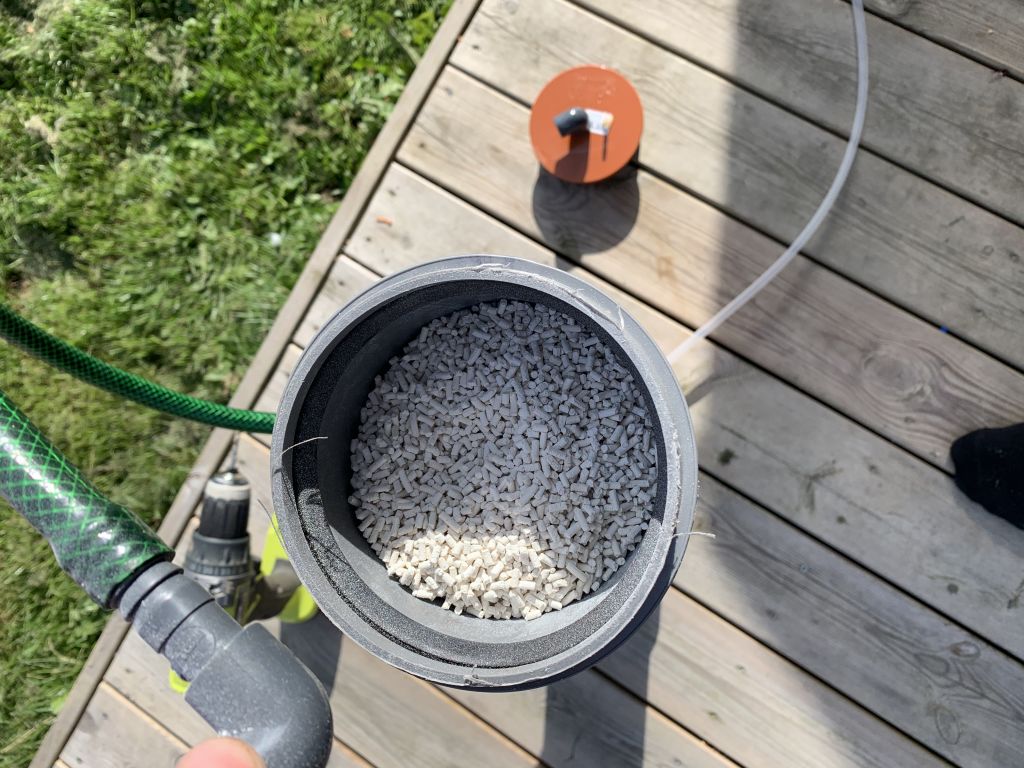 Men min kalkreaktor er høj så jeg kan ikke bare løfte den ud af sumpen, den skal tømmes først, så skal vandet hældes fra, og så kan jeg få den ud. Det betyder også at ret meget vand blive hældt i sumpen med en lav ph værdi, hvilke gjorde ph tog et dyk og jeg havde noget hvidt vand i baljen.
