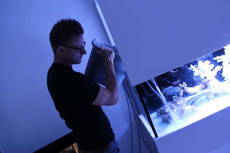 Heldigvis kan rørføringne jo skjules i vores store "lyskasse". Carsten havde heldigvis gode ideer til hvordan den kunne sidde på skrå over akvariet. Der skulle jo også tages hensyn til lampeplaceringen.