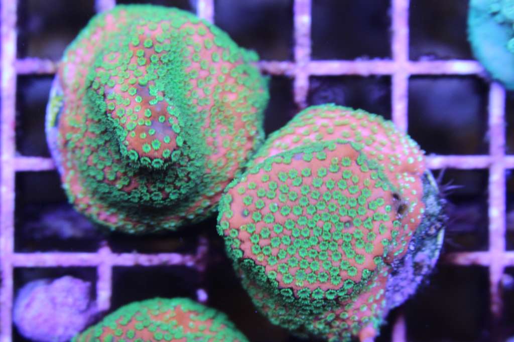 Spændene udvikling. Her er korallen fragmentet er fra. Super flot koral, meget lys grøn tæt på gul, med lys hud imellem polypperne som er mere lys grønne.