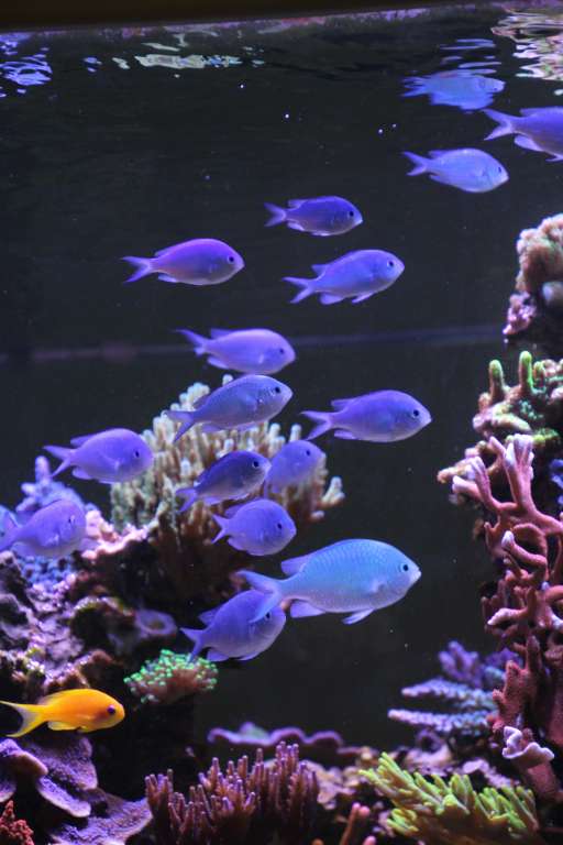 Sjovt fænomen. Efter der er kommet gyre pumper på min balje, med den nye styring, er mine chromis begyndt at stime. Cirkulationen er en lodret gyre, drevet at to pumper, som skifter retning hver 5 min. De står og svømmer hvor der er mest læ af den højeste søjle. Som så gør at de skifter ca. 90 grader omkring søjlen, alt efter hvad retning cirkulationen kører.