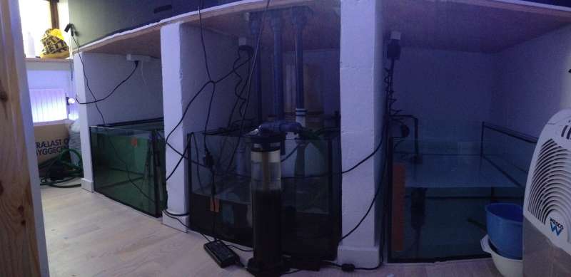 men set fra venstre mod højer så har vi en vanskift tank på 160 liter som også er med alger. men når den ny skummer kommer så bliver den lavet om til ren algetank og frag tank.