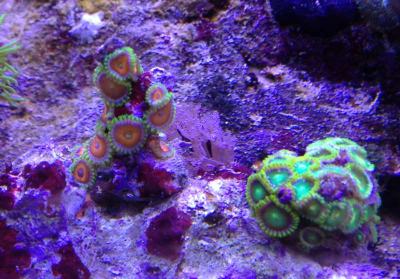 Men én ting jeg syntes er mærkeligt at se, er at jeg har samme type Zoa stående i hver af mine kar og de er FULDSTÆNDIG forskellige fra hinanden. i det ene kar er polypperene ca 2,5 cm i diameter, med lange halse og mørke farver. I det andet er hver polyp ca 8-9 mm, kort halse og meget mere skrigende farver.