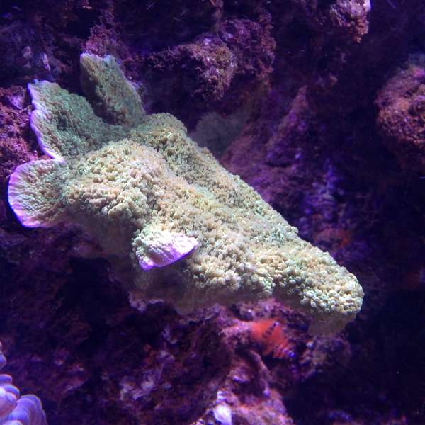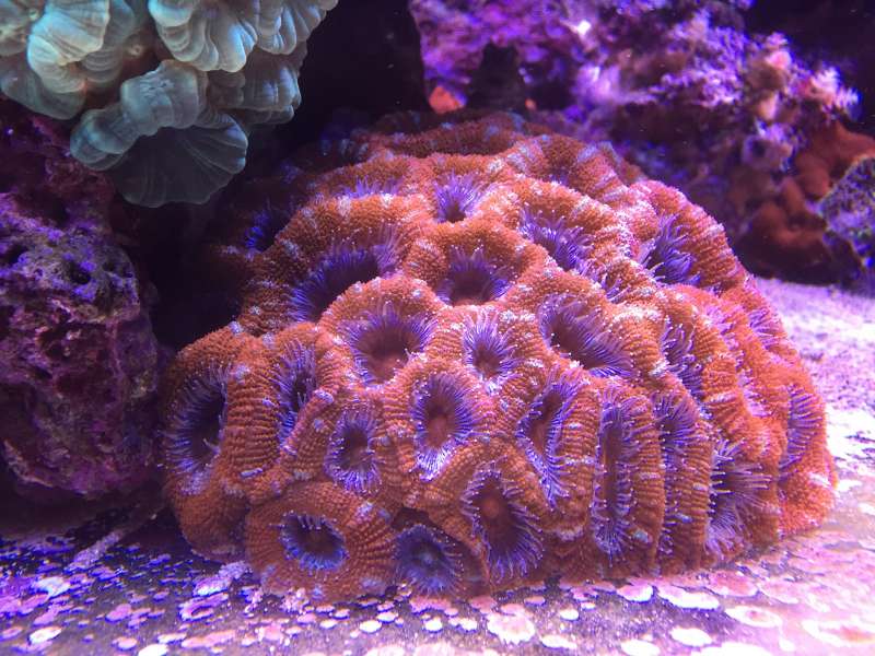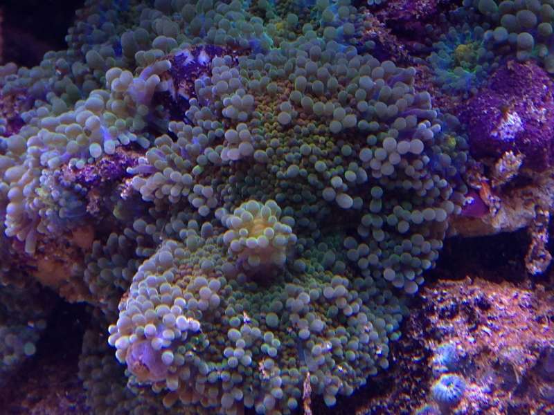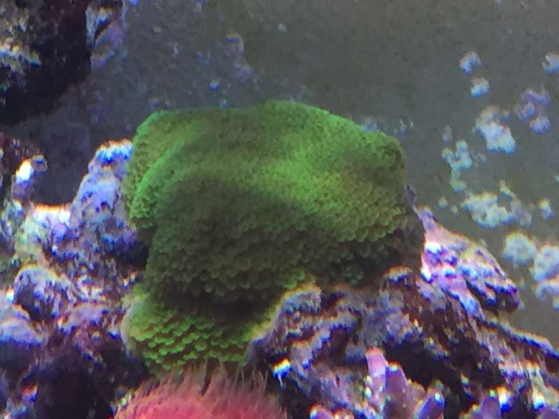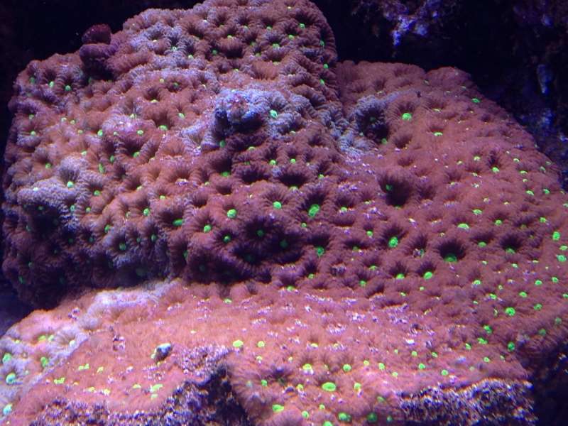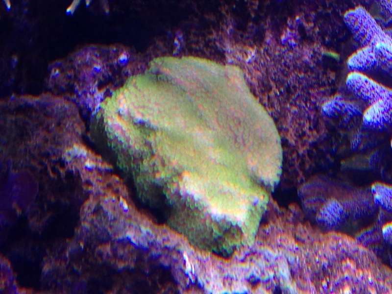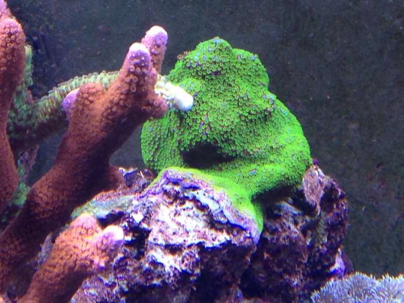 Min Sunset er efterhånden også faldet godt til, den har sat en flot dyb grøn farve og er begyndt at vokse udover stene. "Desværre" har den en kraftig og tæt polyp-udfoldelse så jeg ser ikke rigtig den flotte orange bund