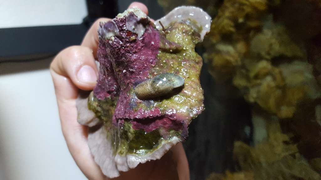 Søharen er mega effektiv. + fandt ud af hvordan jeg skulle holde den i live. Når der ikke længere er mad nok i baljen, så ta en bøtte alá tubberware, lav lidt huller i den. Put af og til sneglen i tubberware med et stykke nori og læg den i sumpen til der er spist op.