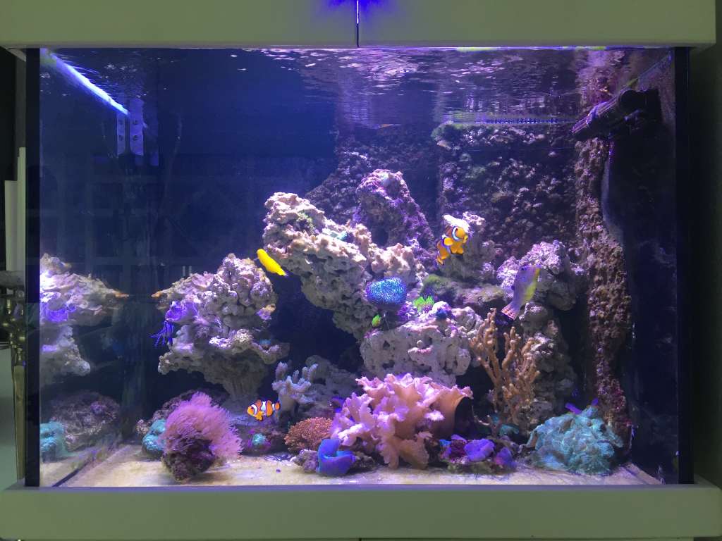 Her er et billede fra d. 6/2 Den ser sådan ud i dag. Derudover er der kommet lidt Montipora i og lidt LPS i form af noget Chalice og en Lobophyllia Fiskebestanden er stadig sparsom og består af et par Occelaris klovne, en gyl gylte, en Fridmani, en Bangai kardinal og en Picassofisk. Næste skridt må være at øge fiskebestanden lidt.