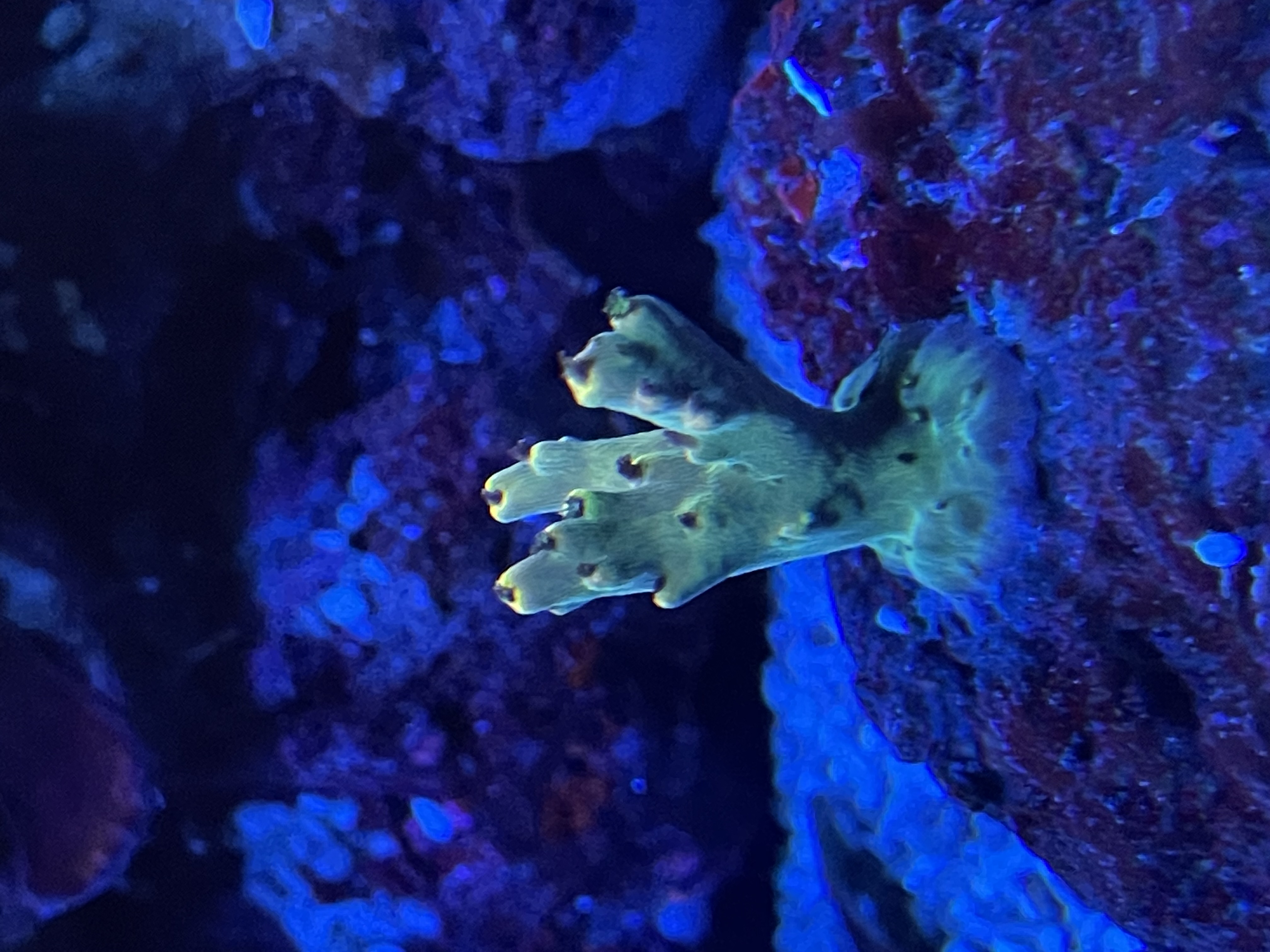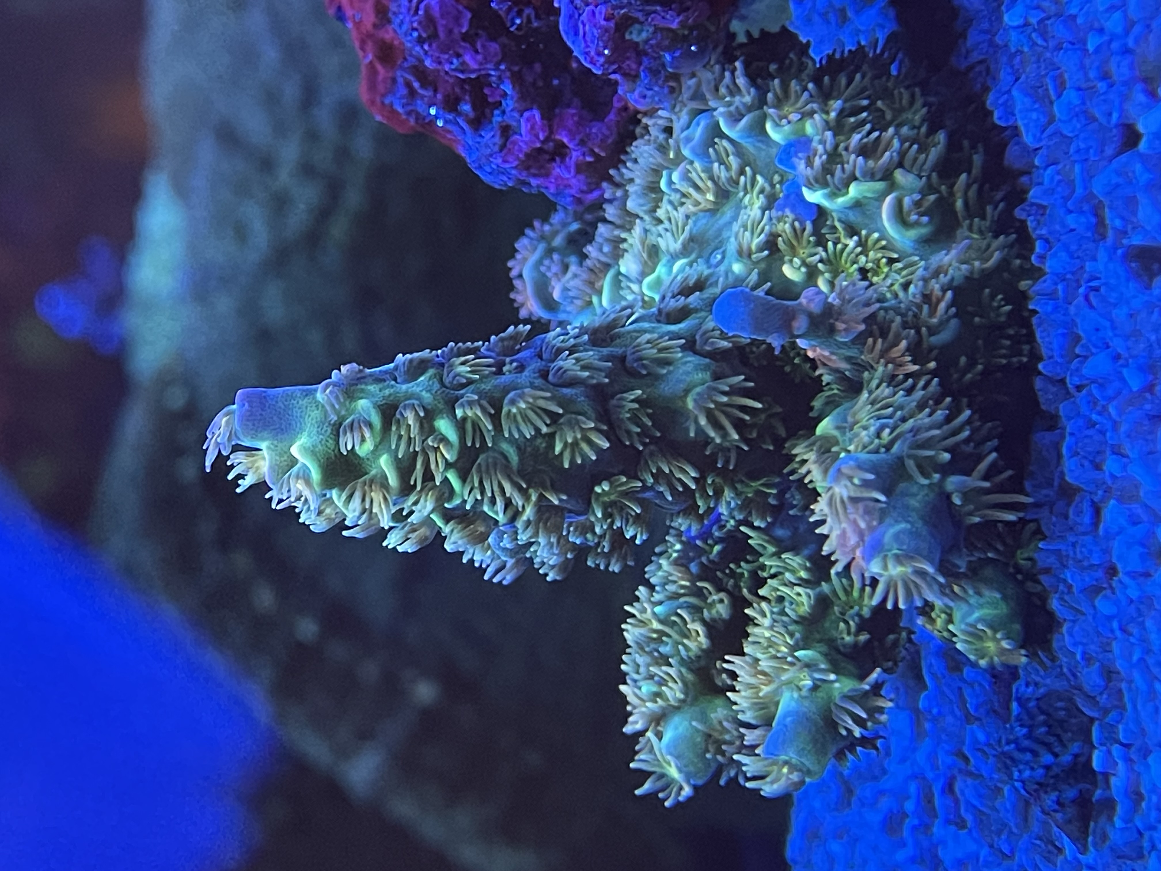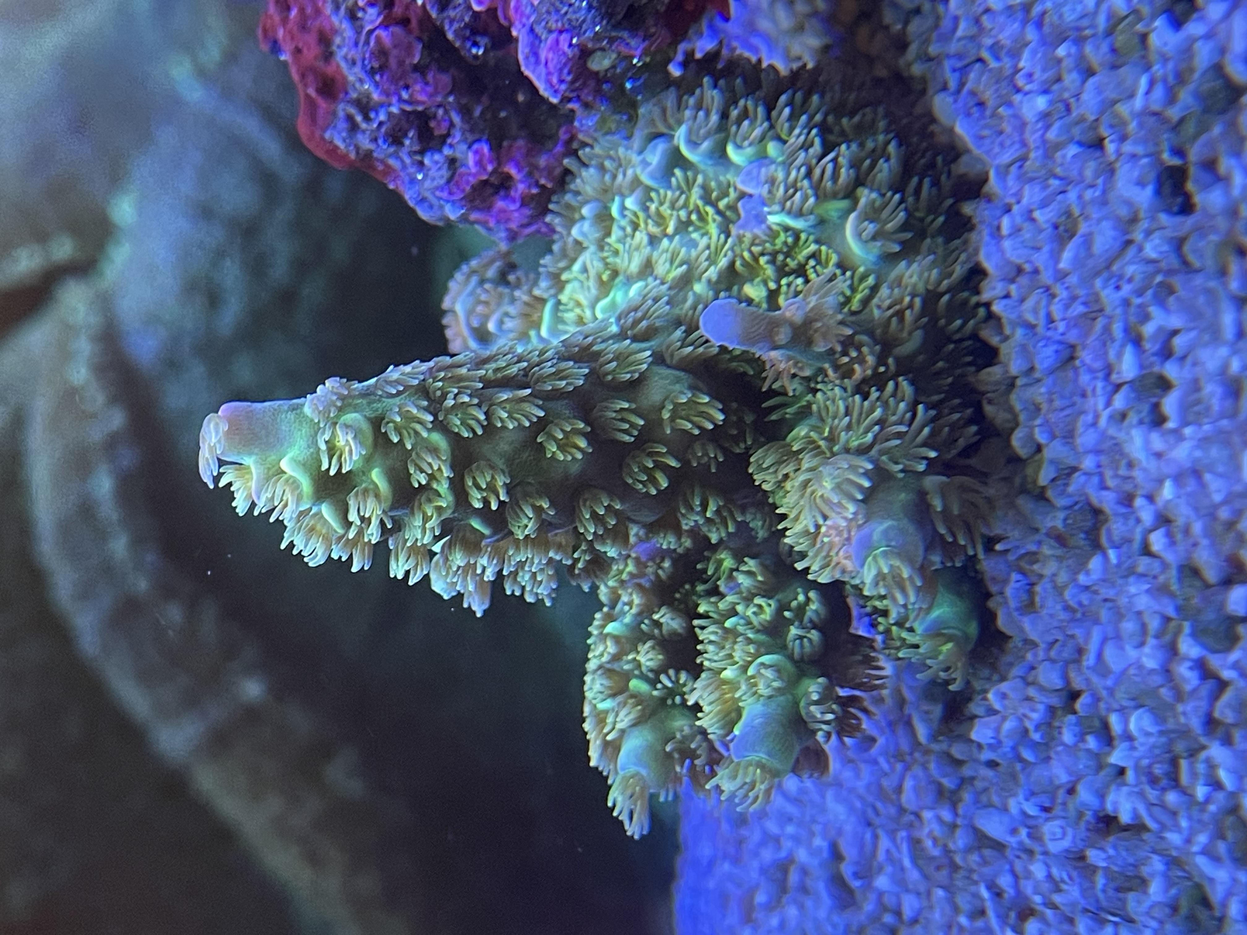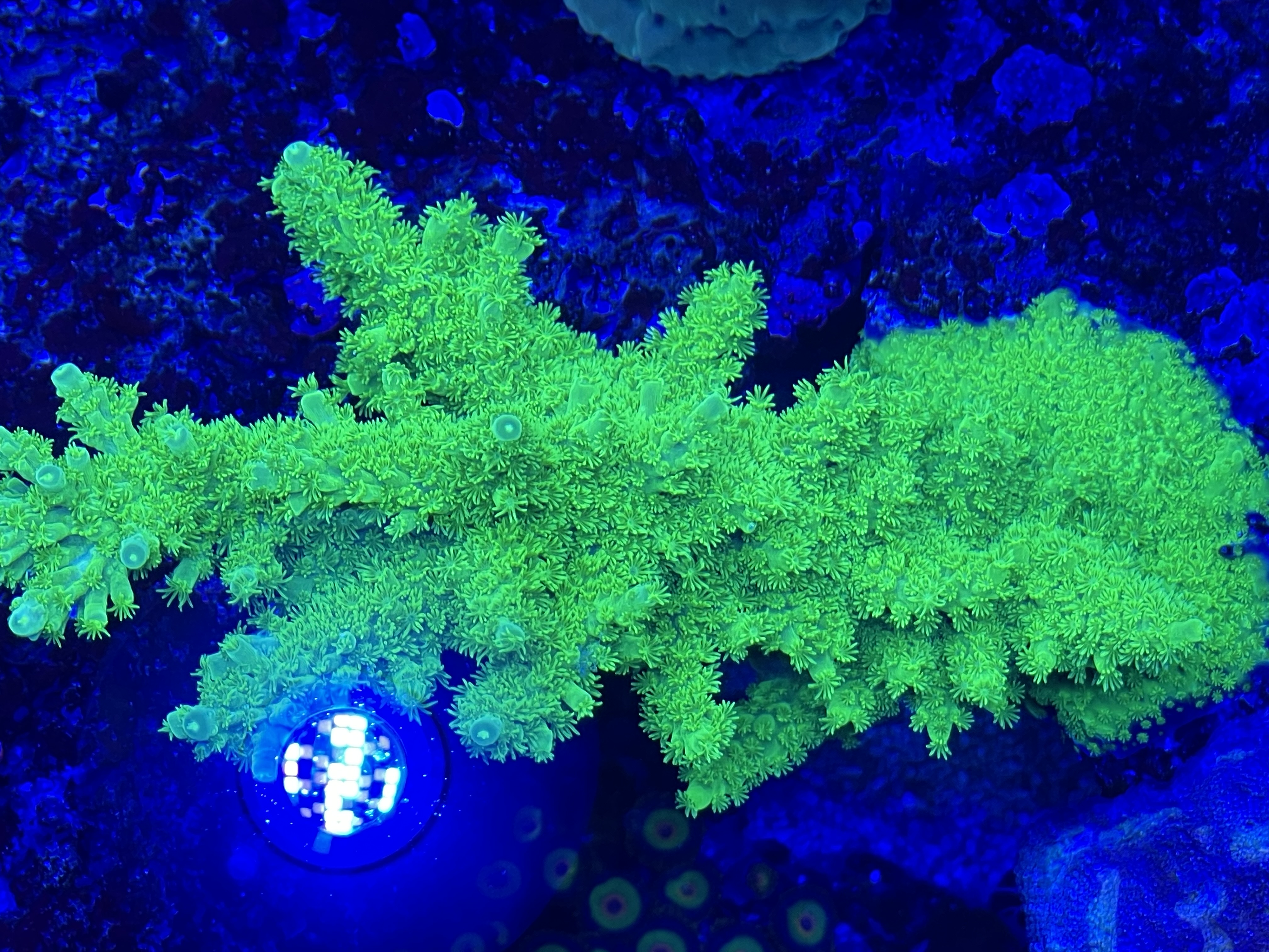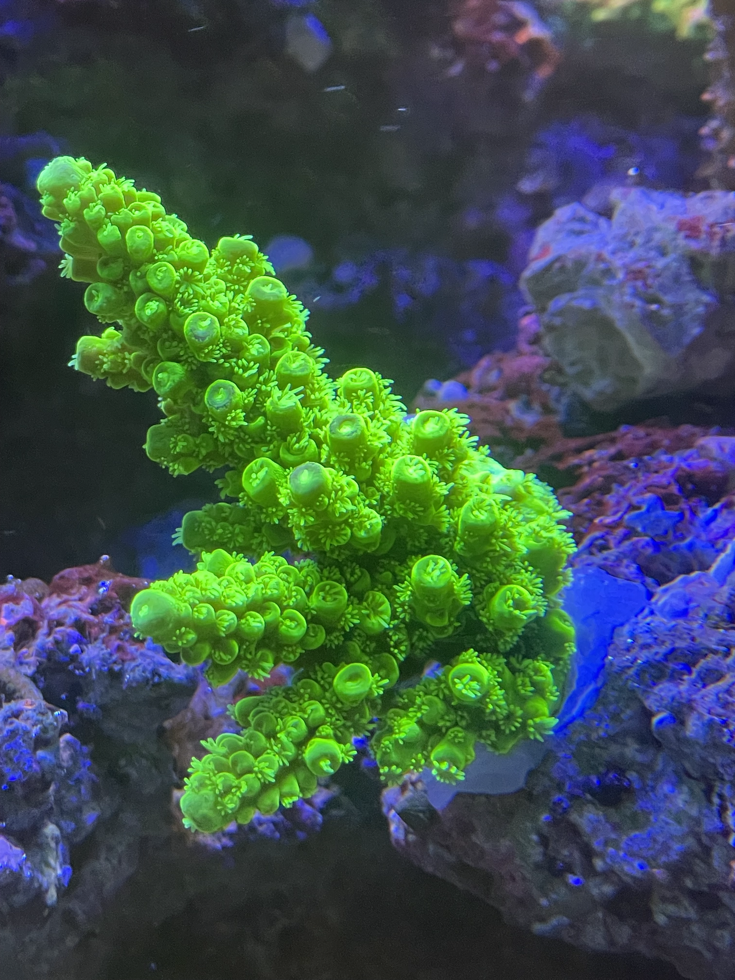 Acropora Efflorescens “deep blue” Er begyndt at få sine gule polypper