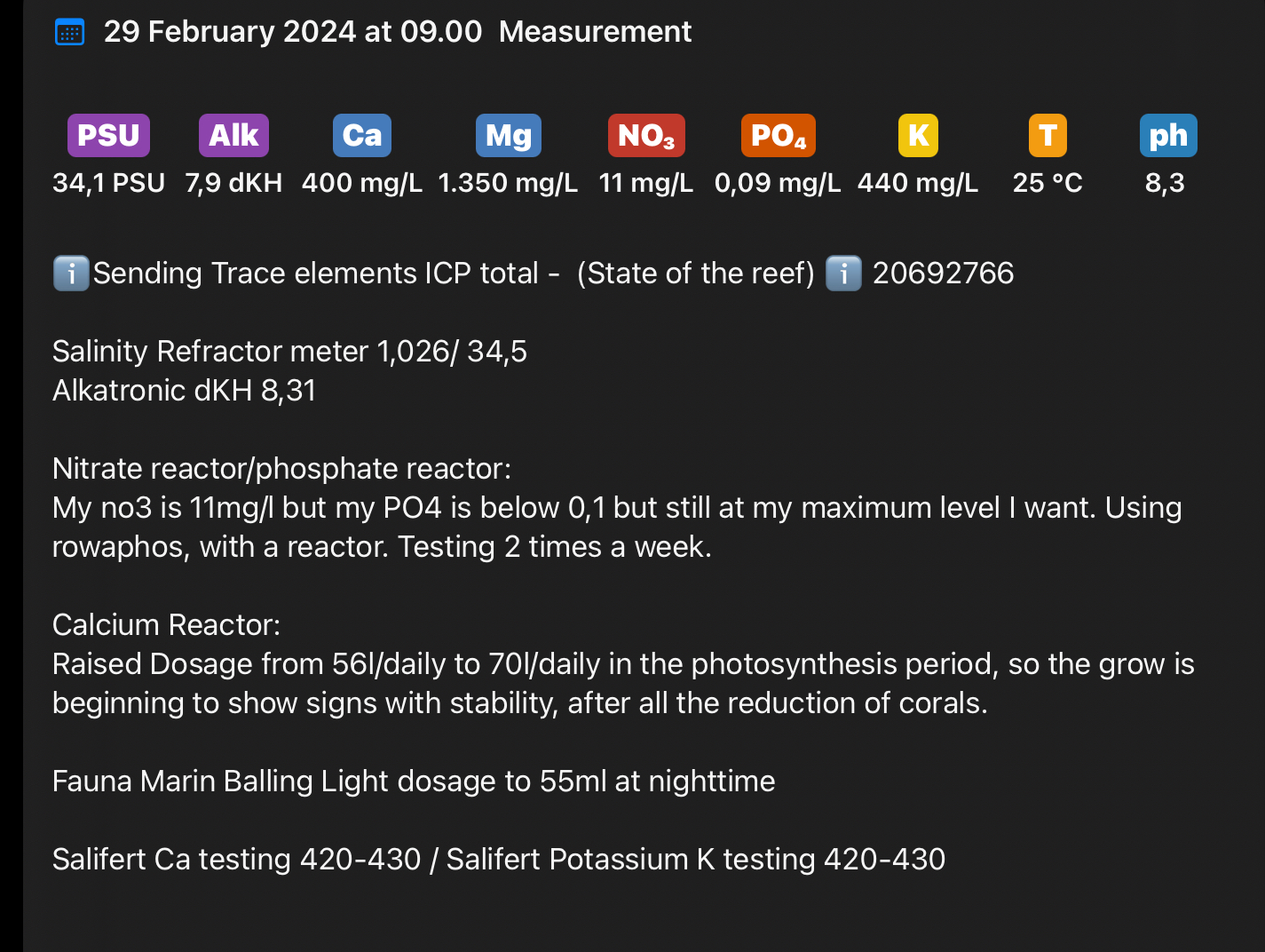 Mit Kalkreaktor gennemløb er steget fra 56l/Dagligt til 71L, samt natlig dosering af Balling KH er steget også.