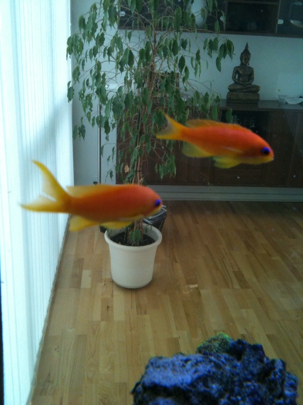 Det ser ret sjovt ud, at det ligner de blot hænger i den blå luft - grundet din installation af akvariet hvor man kan se det var begge sider på de store fladerNicki Henriksen skrev:Jeg kan da lige smide et par billeder af mine Pseudanthias squamipinnis small de er vel 5-7 cmronny.w skrev:Kunne godt tænke mig at se den aktuelle størrelse på jeres fisk.
