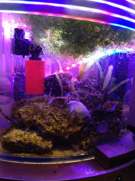 Det ser jo simpelthen ganske forfærdeligt ud! Ikke desto mindre har vi fine fisk i, deriblandt en korankejser, en foxface og en fuglegylte på snart 20cm hver, plus 3 klovne, damsler og andre småfisk. Der har været et dødsfald på de sidste 2 år!
