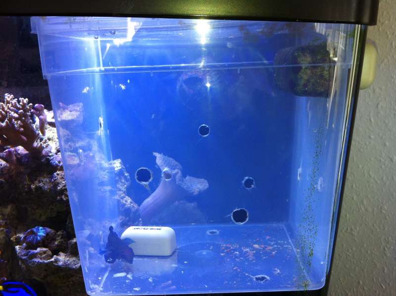 Det kan godt være Kim, men det fungerer og jeg har fundet flere eksempler fra USA, hvor samme metode er brugt. Det var jo der jeg fik ideen. Planen er at han ryger i sit eget nano på et tidspunkt. Jeg vil dog gerne se en lidt højere foderrespons fra ham i den det sker. Mandarinen udviser ingen tegn på stress men lader faktisk til at trives bedre i boksen end i akvariet hvor min sejlfinne kirurg var lidt over den. Hellfish og Dan, hvordan går det med jeres ?