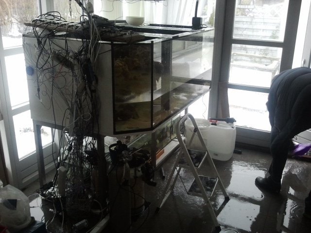 Så gik bunden på akvaret øv øv øv og vand i hele havestuen og alt elektronik er brændt af.