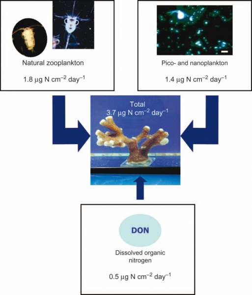 Some corals are able to shift the balance between energy gained from photosynthesis, particles and dissolved molecules when required15,30. Specimens which inhabit deeper waters receive less light, and bleached or azooxanthellate corals have to gain energy from other sources than photosynthesis. Montipora capitata colonies have been found to increase their plankton feeding rates after bleaching, which completely satisfies their daily metabolic requirements12 (table 2).