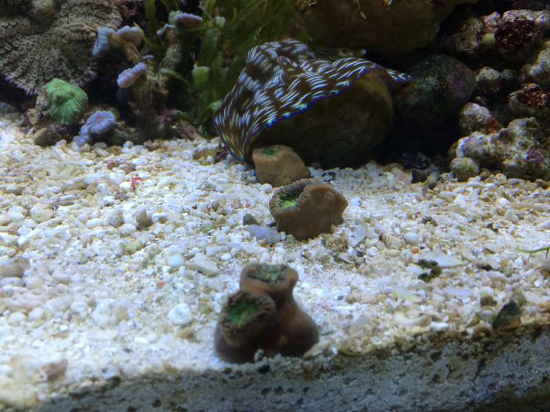 Heteropsammia cochlea (3stk) og en tridacna derasa som hygger i den nye sandbund.