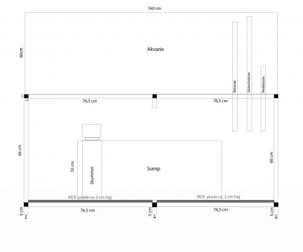 Selve akvariet er et 530L's akvastabil (http://www.tropefisk.dk/shop/effectline ... 7222p.html), Mål (l x b x h): 160x55x60 cm. Selve bordet er lavet at porsa aluminiumsrør (akvarieudstyr.dk). Stellet er blevet malet med hvid spraymaling. Rundt om aluminiumsstellet skal der påsættes MDF-plader.