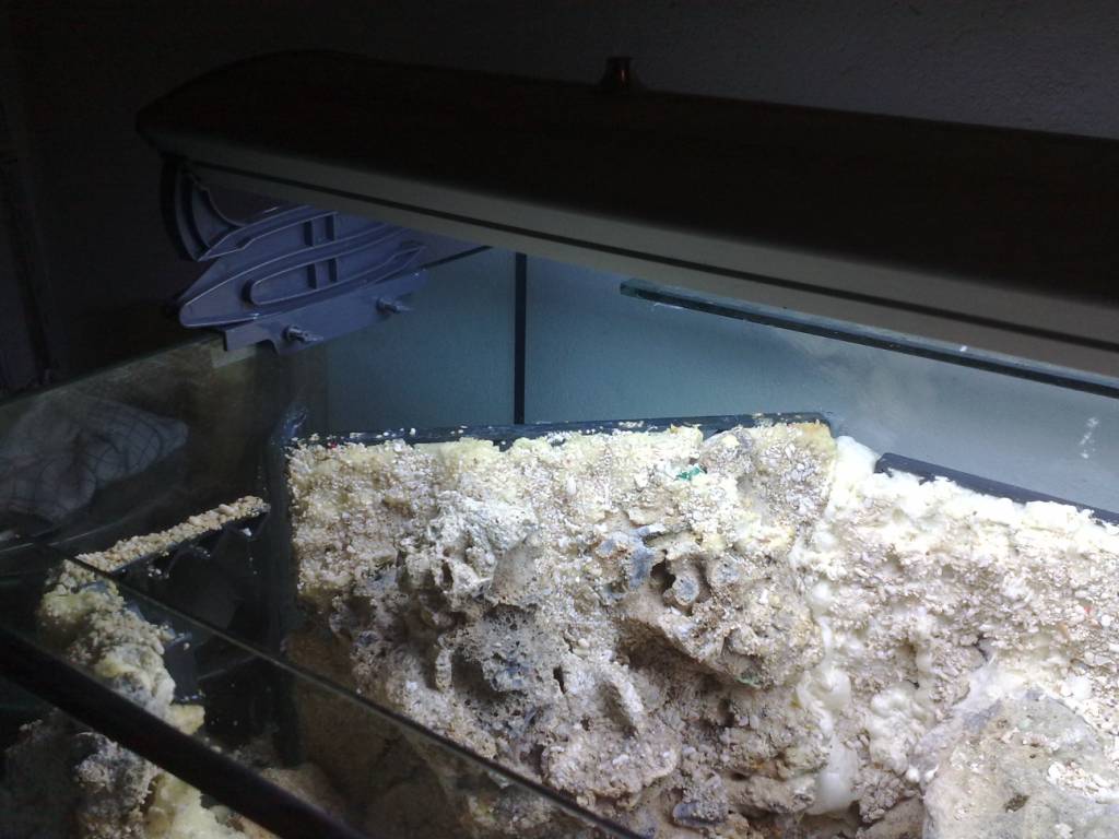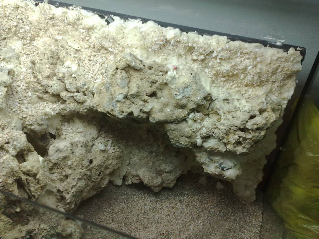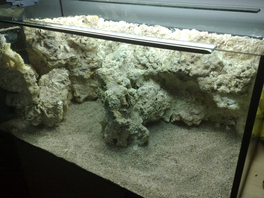 Akvariet er 250L 100x50x50. Jeg har købt noget plastikgitter ved koiimport og stripset døde levende sten på fra saltvandsbutikken.Der er 30-35 kg i alt. Mellemrummene har jeg fyld op med PU skum.